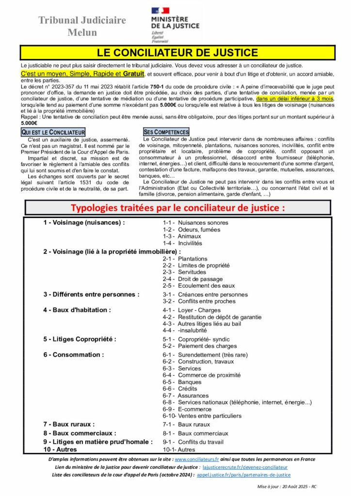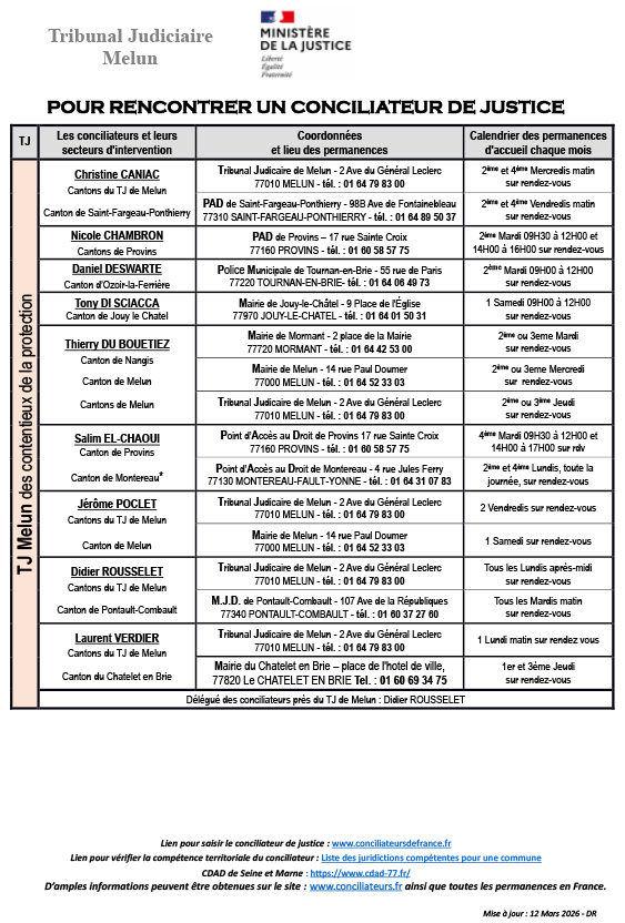Liste actualisée au 12 mars 2026 des conciliateurs de justice du ressort du tribunal judiciaire de Melun