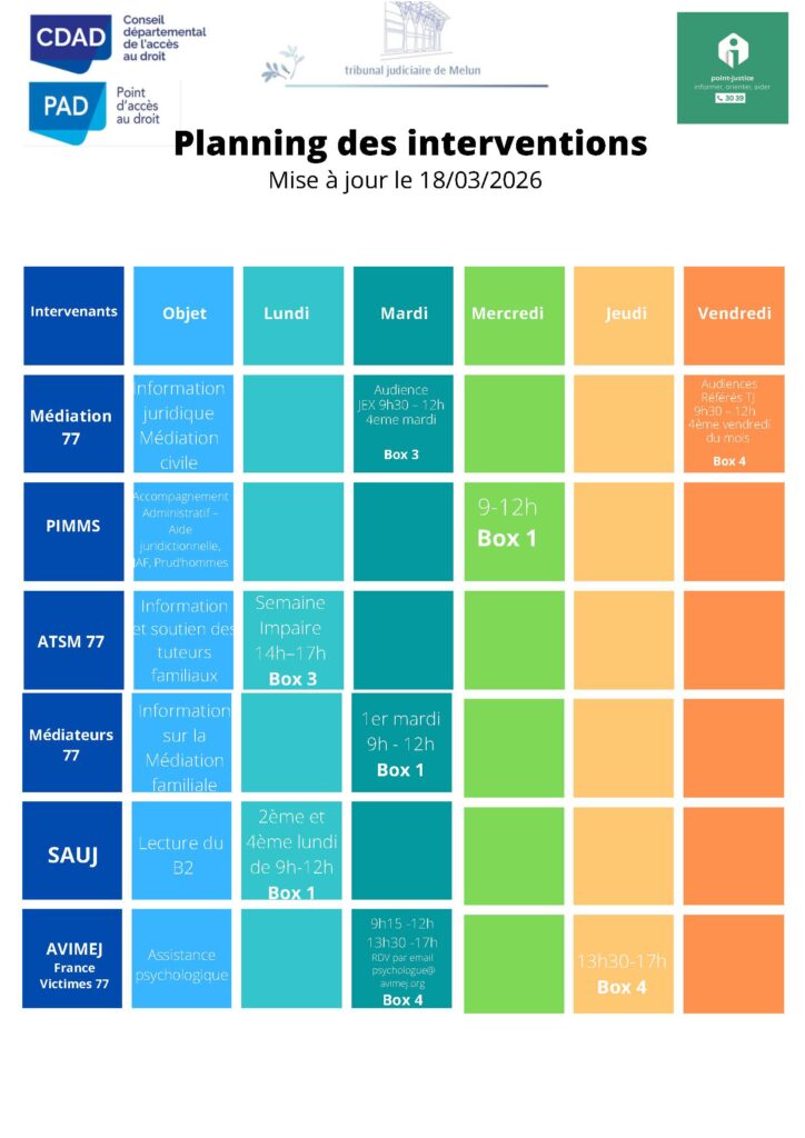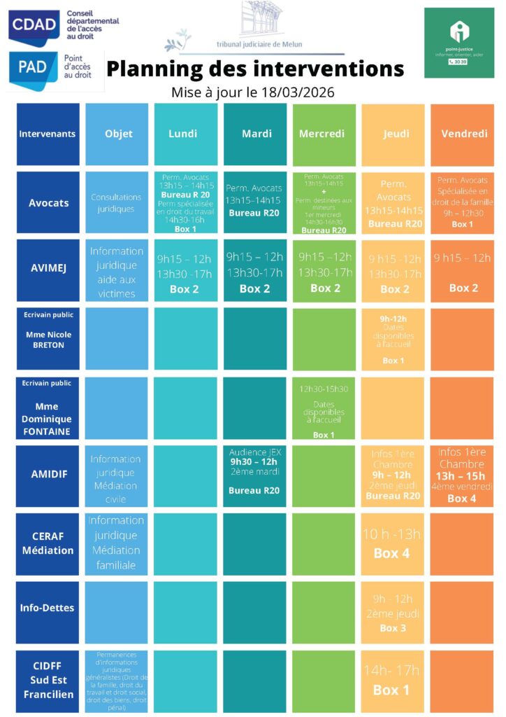 Planning des interventions du Point-Justice TJ de Melun 18 mars 2026